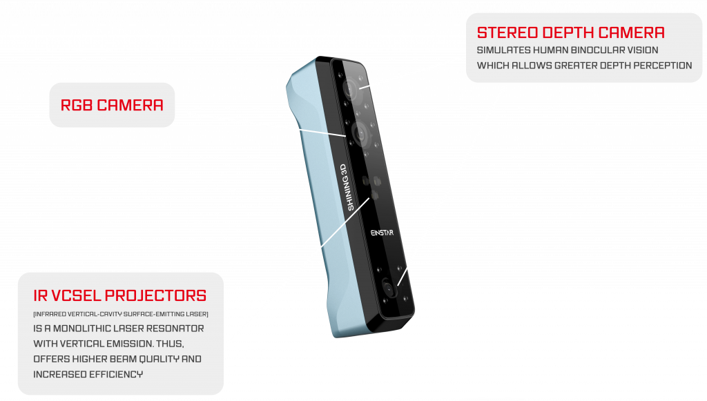 Equipped with 3 Infrared VCSEL Projectors, 2 Stereo Depth Cameras and 1 RGB Camera, EinStar can capture clear scan data in outdoor settings and in daylight.